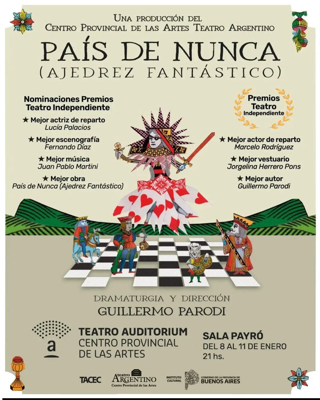 “País…” viene de ganar tres Premios al Teatro Independiente como Mejor Actor de Reparto (Marcelo Rodríguez), vestuario (Jorgelina Herrero Pons) y autor (Guillermo Parodi), además de recibir las nominaciones como Mejor obra, Mejor Actriz de Reparto: Lucía Palacios, Música: Juan Pablo Martini y Escenografía: Fernando Díaz.